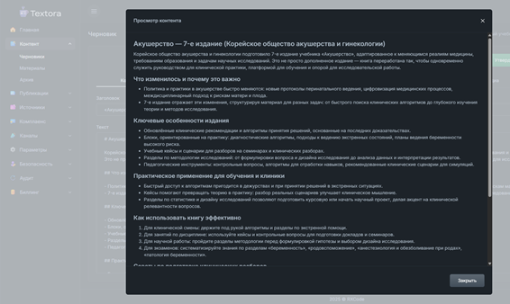 “Раньше на одну статью для сайта и три поста в соцсети мы тратили 4–6 недель и минимум 5 человек: медик, юрист, копирайтер, переводчик и SMM. После подключения Textora тот же объём мы закрываем за 2 дня силами одного контент-менеджера.”